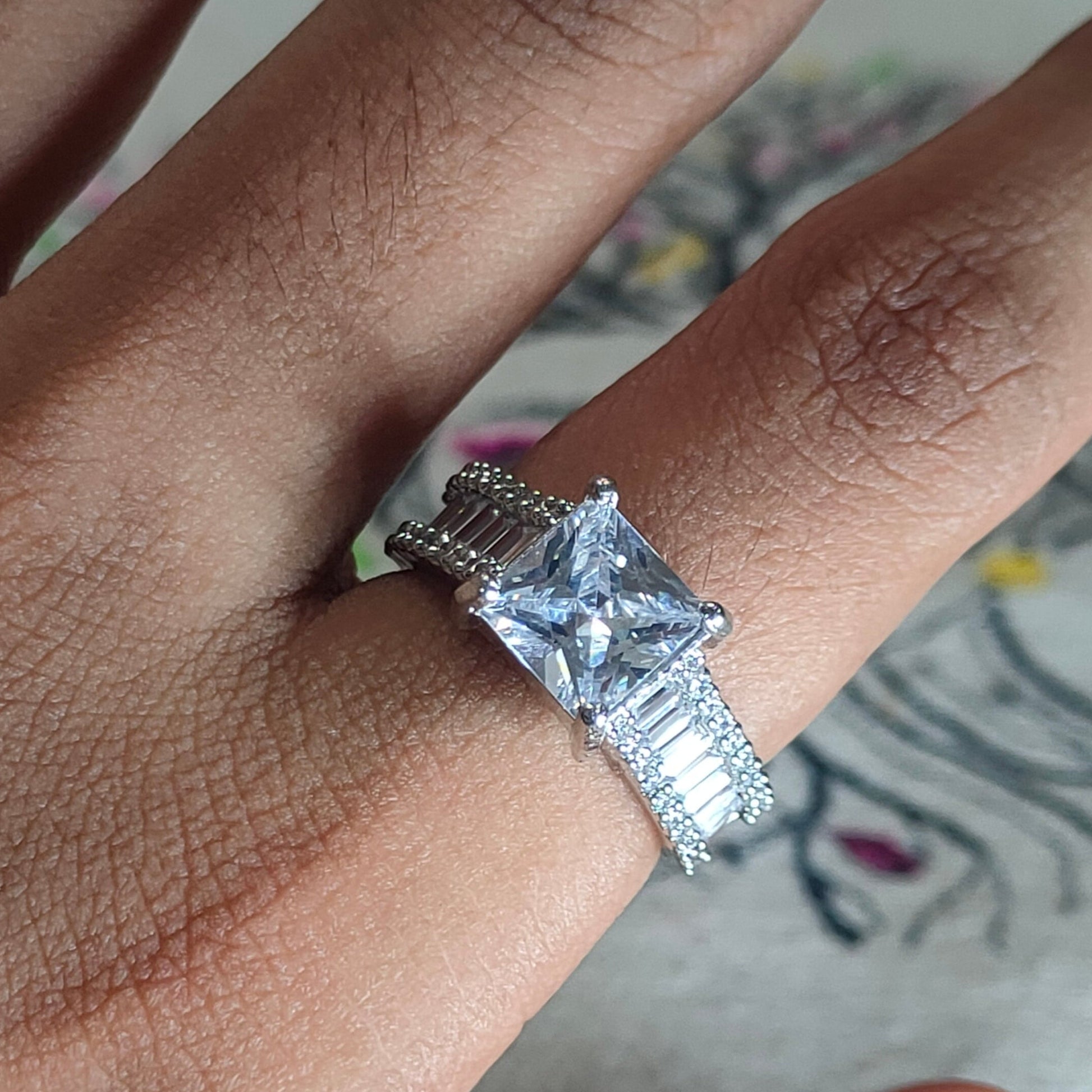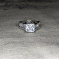 The ring in the image is identified as a Bel Viaggio 14k White Gold Moissanite Engagement Ring. It features a large, square-cut moissanite stone as its centerpiece, flanked by smaller baguette-cut stones set along the band. Moissanite is a lab-created gemstone known for its brilliance and durability, often used as a diamond alternative. It is made of silicon carbide and is almost as hard as a diamond.