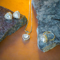The jewelry set is identified as the "Studio Voylla 925 Silver Sterling Heart-Shaped Pendant Set". It includes a pendant necklace, a pair of earrings, and a ring, all featuring a heart-shaped design adorned with cubic zirconia stones. The set is made of 925 sterling silver, which means it consists of 92.5% pure silver and 7.5% other metals, usually copper or zinc. It is also plated with rhodium, a metal that enhances shine and durability, preventing scratches, dents, and corrosion. The zirconia stones are designed to resemble diamonds, offering a similar sparkle. The necklace comes with an 18-inch chain and the set is presented in a gift box, making it suitable for gifting.