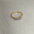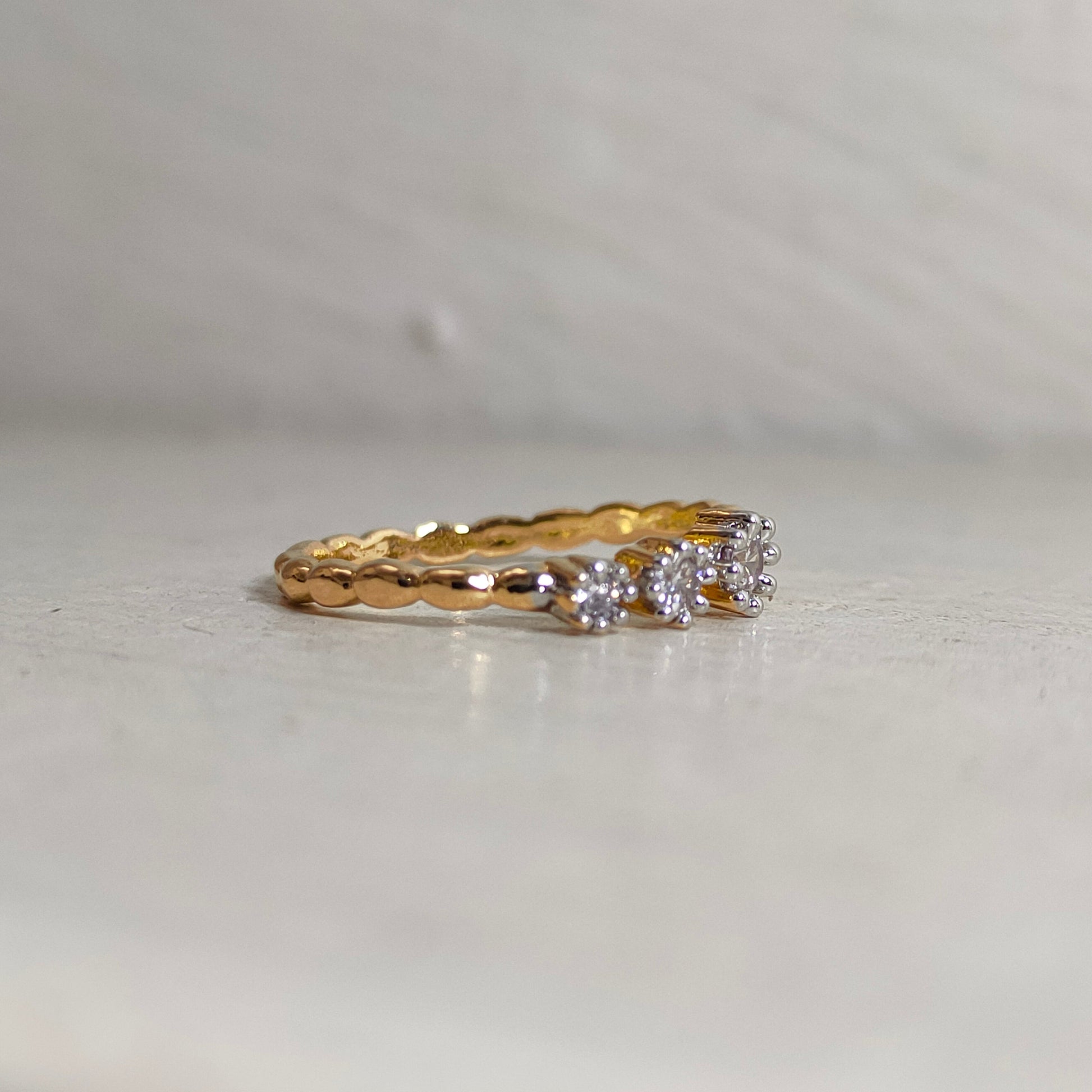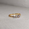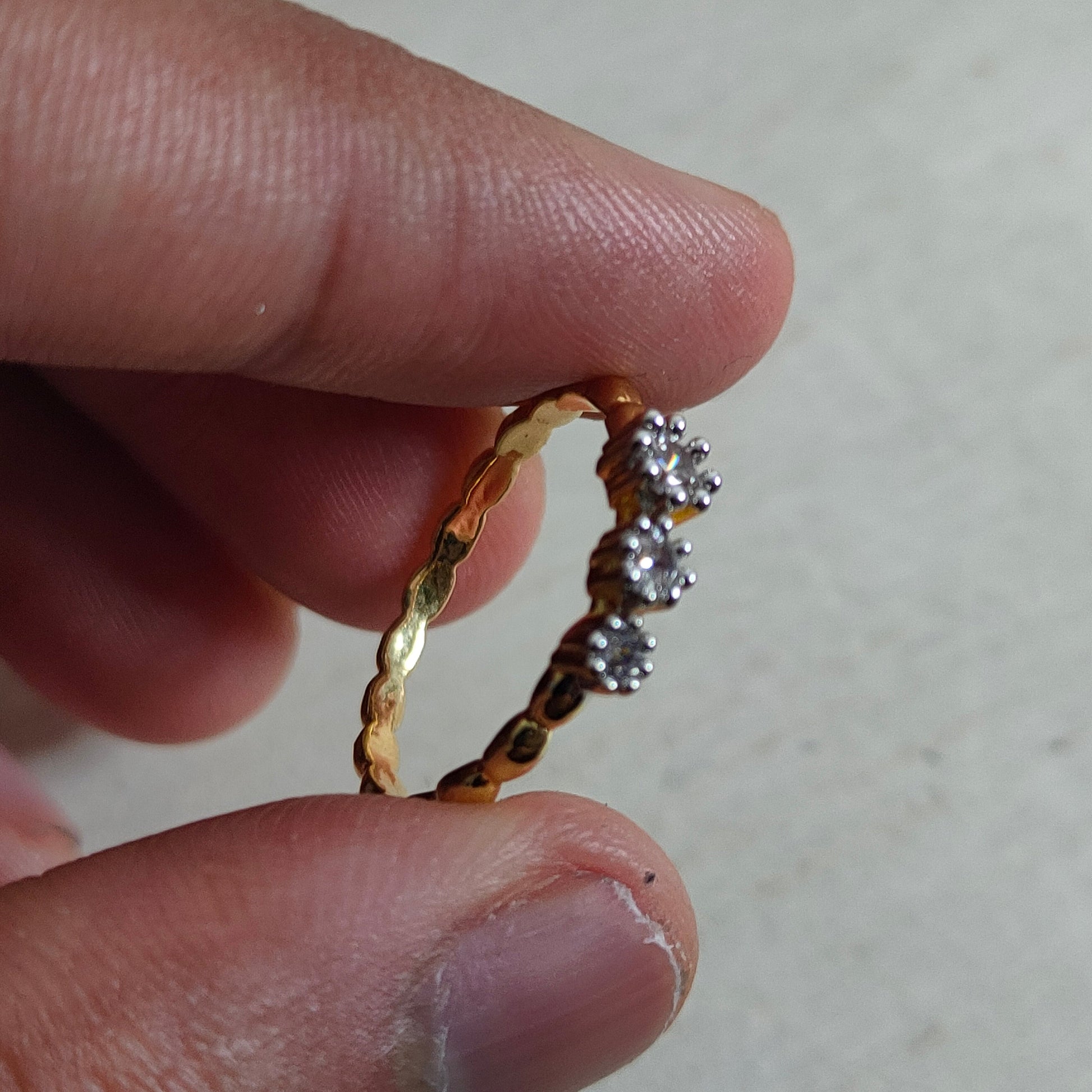 Gold plated ring with three small gemstones, possibly diamonds or cubic zirconia. The band appears to have a textured or braided design. It is difficult to definitively identify the materials and gemstones due to the image quality and lack of additional context. Without more information, a precise description is challenging.